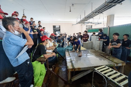 ↑セリ市見学の様子 セリ落とされた魚を「明石浦〆」している様子↑
