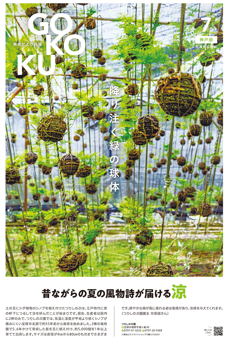土の玉にシダ植物のシノブを植え付けたつりしのぶは、江戸時代に家の軒下につるして涼を呼んだことが始まりです。現在、生産者は国内に2軒のみで、つりしのぶ園では、気温と湿度が平地より低くシノブが傷みにくい宝塚市北部で約55年前から栽培を始めました。3棟の栽培園で5、6年かけて育成した苗を玉に植え付け、約5,000個を1年以上育てて出荷します。サイズは直径が9cmから80cmのものまでさまざまです。鮮やかな緑が風に揺れる姿は風情があり、涼感を与えてくれます。(つりしのぶ園園主 市原誠さん)