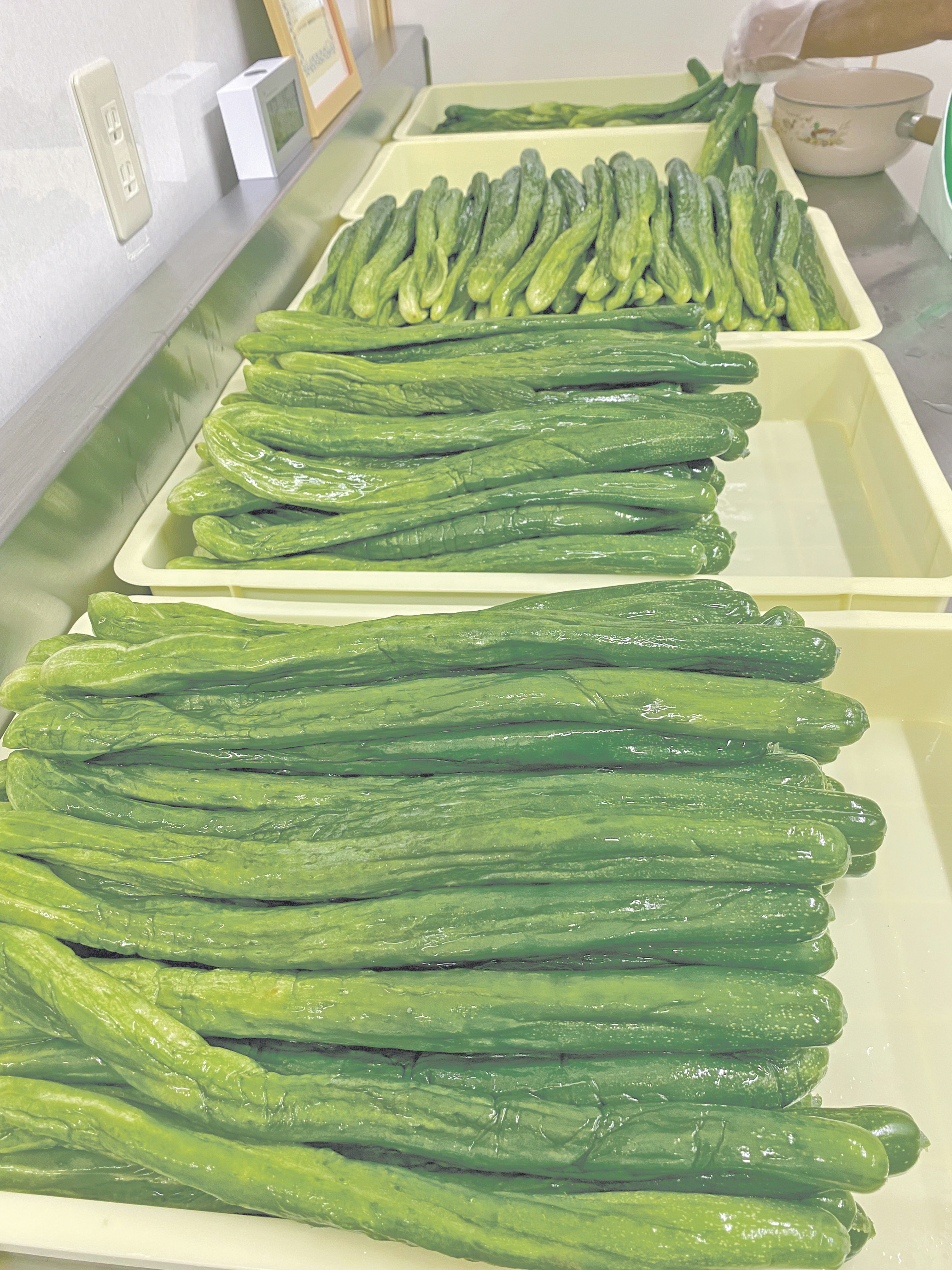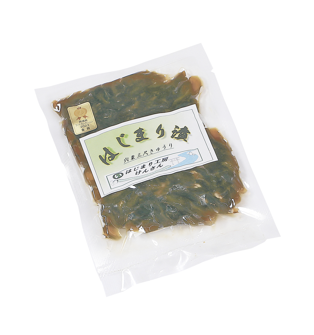 最長3尺(約90cm)まで成長する「宍粟三尺きゅうり」の栽培を10年前に始め、現在はかす漬け「はじまり漬」を製造しています。宍粟三尺きゅうりは一般のキュウリより水分が少なく、歯応えの良さが特徴。1950(昭和25)年ごろから宍粟郡(現宍粟市)で生産が始まり、60年代には阪神間へ出荷されていましたが、今は一部農家が自家用に作るだけになりました。宍粟が日本酒発祥の地といわれることにちなみ3年がかりで開発したはじまり漬は、シャキシャキの食感とともに酒かすの甘みがほんのり広がり、塩辛さを抑えているので子どももおいしく食べられます。製品を通して、宍粟の伝統野菜と発酵文化のPRにつながればうれしいですね。(はじまり工房けんさん 井上憲三さん)