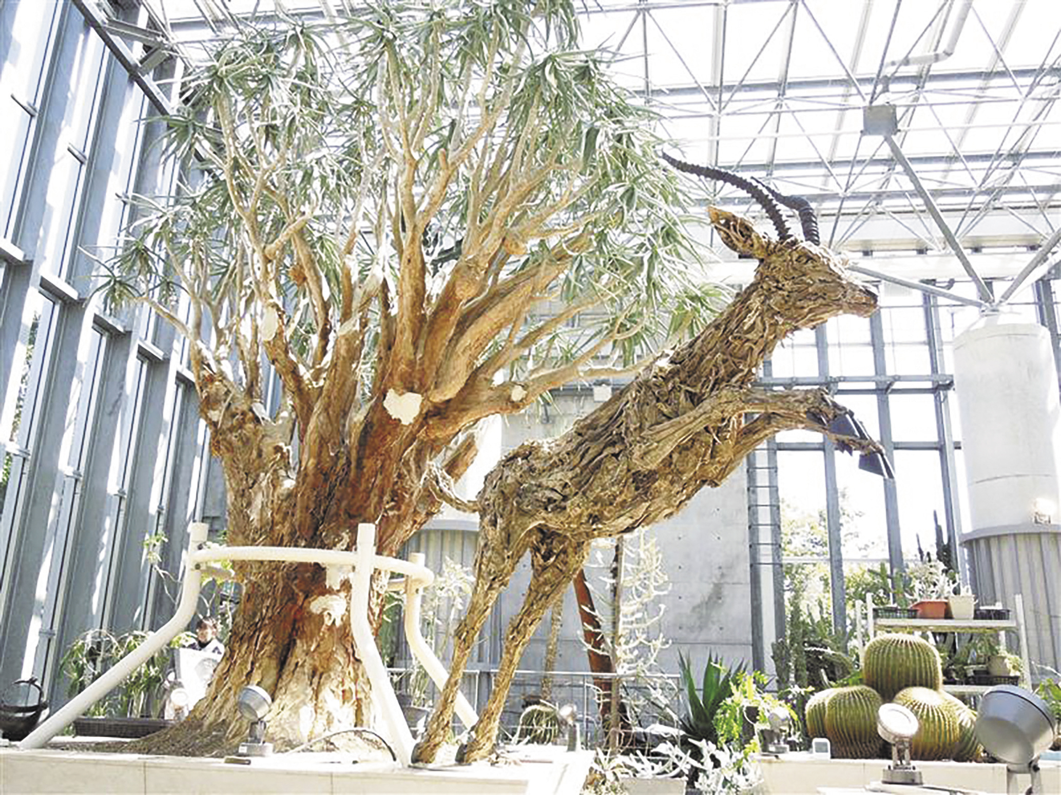 流木アート「ジャンピング・ガゼル」。彫刻家、ジェームズ・ドラン・ウェッブさんの作品の常設展示は国内初。