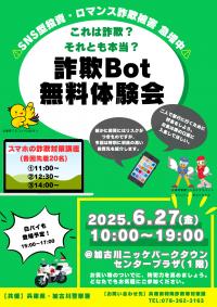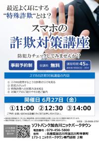特殊詐欺への対策、スマホを使用する上での詐欺のリスクを知り、防犯力を高めていただくための講座を実施します。事前予約制となっておりますので、奮ってご参加ください。