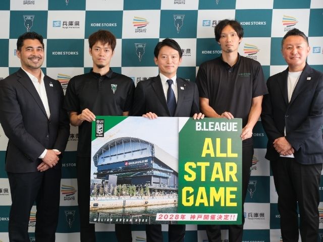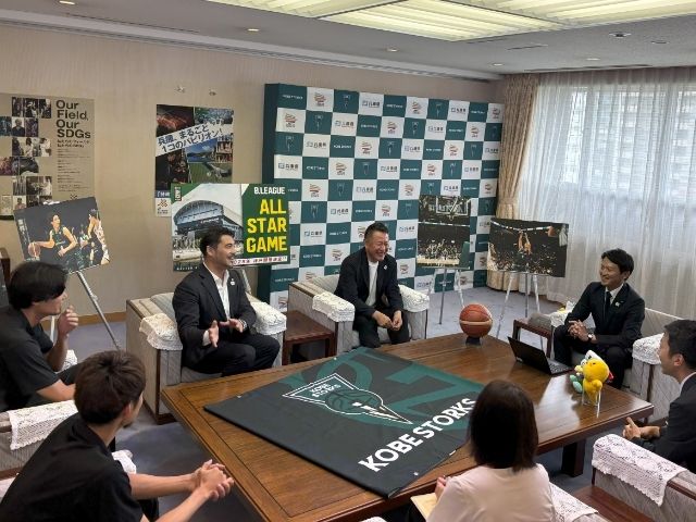 神戸ストークスの渋谷順代表取締役社長、西村大介取締役副社長、兵庫県出身の谷直樹選手、道原紀晃選手が、2024-25シーズン終了および活動報告のため、齋藤元彦知事を表敬訪問しました。また、B.LEAGUE ALL-STAR GAME 2028の兵庫・神戸開催決定を受け、クラブとしての意気込みや地域との連携強化への想いも語られました。