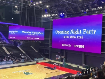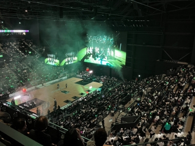 TOTTEIに行くとまず圧巻なのが270°海を臨むアリーナの勇姿です。夜になるとライティングで海際にひときわ綺麗な情景を現します。収容人数は1万人。屋内アリーナ最大級の4K LEDビジョンや昇降式のセンターハングビジョンなどで映し出される模様は、本当にダイナミックで、宛ら海外で観戦しているかのような錯覚に陥るほどです。