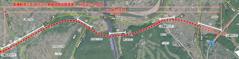 平成26年度から、八幡稲美ランプ以北(北工区)に事業着手し、令和5年3月21日に八幡稲美ランプ~八幡三木ランプが部分開通しています。