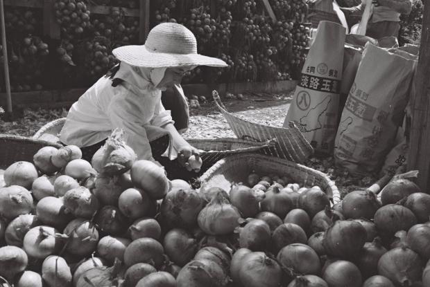 明治の中頃、泉州地方から伝わったといわれる、淡路島の玉ねぎ栽培。収穫後、出荷に向けて箱詰め、積み込みをする様子。