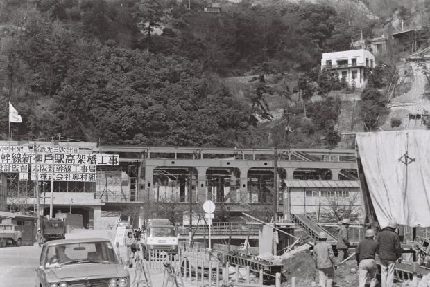 山陽新幹線 新神戸駅の建設中の様子。六甲山の山裾にあり、六甲トンネルと神戸トンネルの間のわずかな区間に建設されている。