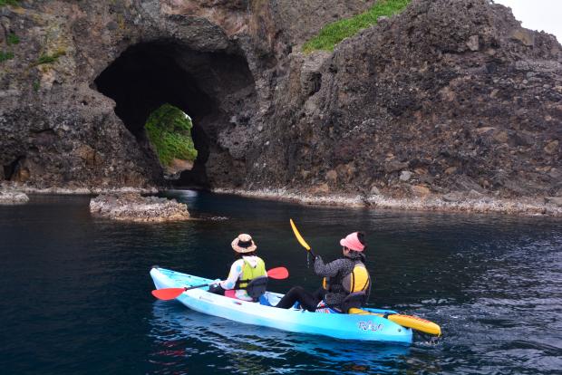 「淀の洞門」は切浜海岸の北端の岬にある高さ約18mの洞門で、世界認定された「山陰海岸ジオパーク」の主な見どころです。カヌー(シーカヤック)に乗って海の上から間近に見る洞門は迫力があり、神秘的な雰囲気もあります。