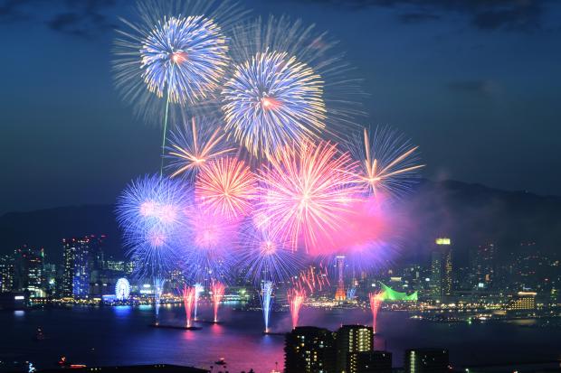六甲山系をバックにポートタワー、海洋博物館などの神戸を代表するランドマークと花火の共演。港の中心部からは尺玉を含むダイナミックな花火が打ち上がります。