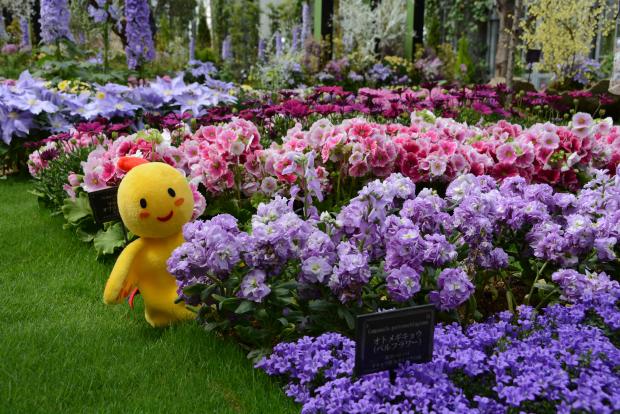 淡路夢舞台のシンボル施設「奇跡の星の植物館」に咲くサクラソウとはばタン