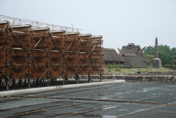 赤穂市立海洋科学館・塩の国には塩田が復元されており、実際に塩づくりを体験することができます。写真の奥には、濃くした塩水を煮つめて塩を取り出すための建物、釜屋があり、左には竹の小枝で組み立てた、枝条架と呼ばれる水分を蒸発させて塩分を濃くする装置が写ります。