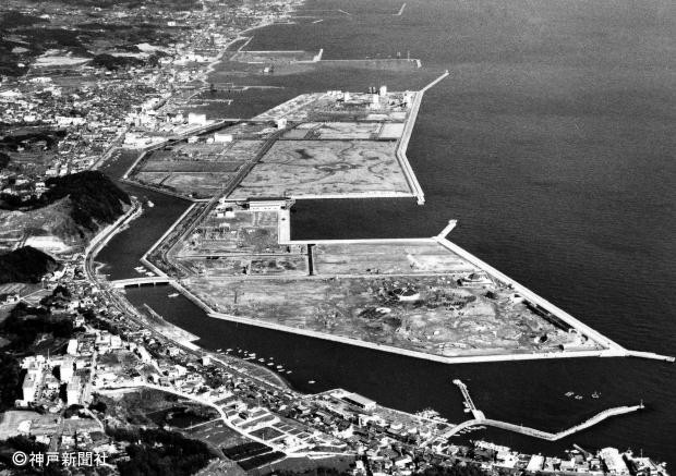 1985年(昭和60年)淡路島と徳島を結ぶ大鳴門橋の開通を記念して淡路島で開催された「くにうみの祭典 淡路・愛ランド博」のメイン会場。開幕に向け、つち音はひときわ高まっている=津名郡津名町(淡路市)塩田新島、おのころアイランド(淡路ワールドパーク ONOKORO)上空