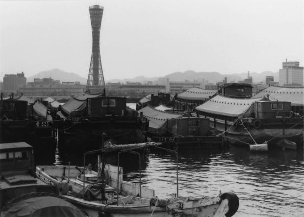 「神戸ポートタワー」は、中突堤に1963年に建設された高さ108mの展望用のタワーです。世界初のパイプ構造の建造物で、鼓を縦に引き伸ばしたような美しい外観から「鉄塔の美女」とも呼ばれています。写真にはまだ埋め立てらていないメリケンパークの辺りの海面に艀(はしけ)が停泊しているのが見られます。