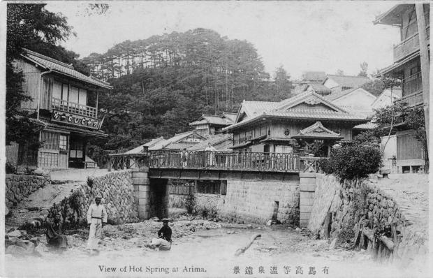 右手に見える六角形の窓の建物は、明治36年に建てられた有馬高等温泉。有馬川にかかる鉄製の太古橋(現在の太閤橋)や川沿いの道路の手すりには洋風のデザインが施されている。