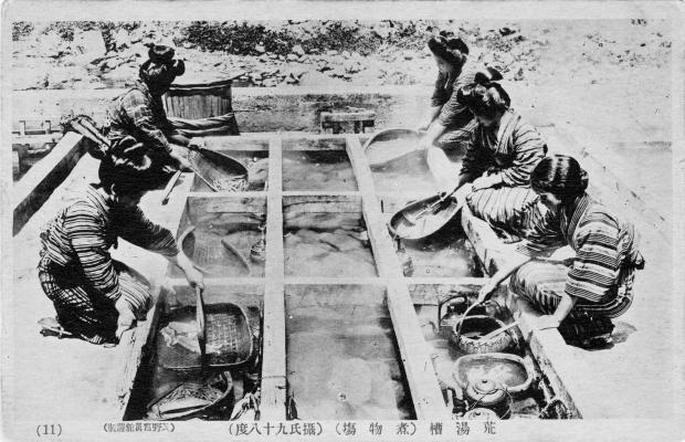 湯村温泉の泉源「荒湯」は無色透明で、口に含むと、少しトロっとしています。これはお湯に重曹が含まれているためです。荒湯で山菜などを茹でるとアクが抜けて野菜の色が鮮やかに美味しくなるのも、泉質に重曹を含むためだと言われています。現在も「荒湯」では観光客が玉子や野菜などを茹でる風景が見られます。