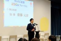 SDGsに取り組む県内企業を顕彰し、更なる普及啓発を行うためのフォーラムを開催。齋藤知事は「人材不足が課題となる中、SDGsの推進は選ばれる企業経営に必要な要素。県でもひょうごフィールドパビリオンをはじめSDGsのすそ野を広げる取り組みを進めている。皆さんも取り組みを更に進め、県内企業を牽引してほしい」と述べた。(1月22日、神戸市)