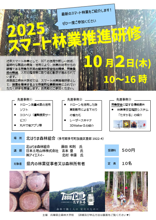 兵庫県立森林大学校では、スマート林業推進研修として、林業を推進する上で効果的な最新技術を習得するための研修を開催します。