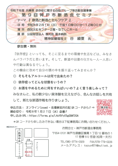 第9回神戸市断酒会セミナー『飲酒と断酒とセルフケア』