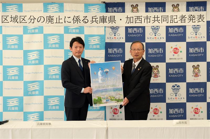 今年度より加西市域における市街化区域と市街化調整区域との区分を本県で初めて廃止し、地域の実情に応じた市による土地利用コントロールに移行。齋藤知事は「今回の改正により、土地利用ニーズへの機動的かつ柔軟な対応が可能となる。転入や企業立地を通じた地域の活性化につなげるべく、県としても広域的な視点から加西市のまちづくりをしっかり支援していく」と述べた。(4月6日、加西市)