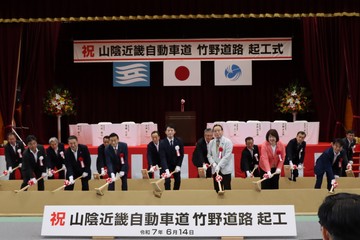 県では、災害対策や観光振興、緊急医療の確保等の課題解決に向け、山陰近畿自動車道の整備を進めており、このたび「竹野道路」の起工式を実施。齋藤知事は「竹野道路が完成すれば、阪神間との観光・物流・経済の一層の交流が期待でき、但馬地域の活性化に繋がる。引き続き、山陰近畿自動車道の早期整備に取り組んでいく」と述べた。(6月14日、豊岡市)