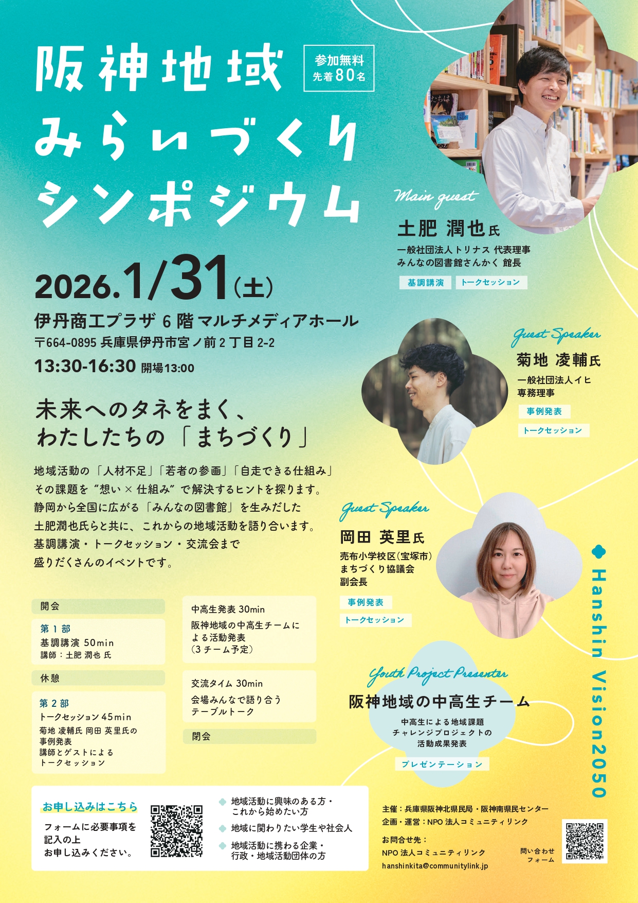 さらにトークセッションでは、阪神地域で活躍する実践者たちも登壇。「どうやって共感を集める?」「若者と一緒にやるには?」といったリアルなテーマについて、ゲストと講師が本音で語り合います。