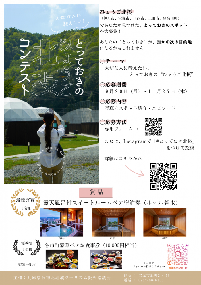 ひょうご北摂の地域資源に光を当てるため、自分だけが知っているとっておきのスポットを大募集するコンテストを初開催!専用フォームまたはInstagramからご応募ください。魅力的なスポットをご紹介いただいた方には、露天風呂付スイートルームペア宿泊券など豪華賞品をプレゼントします。詳細は、特設HPや【関連資料】をご確認ください。