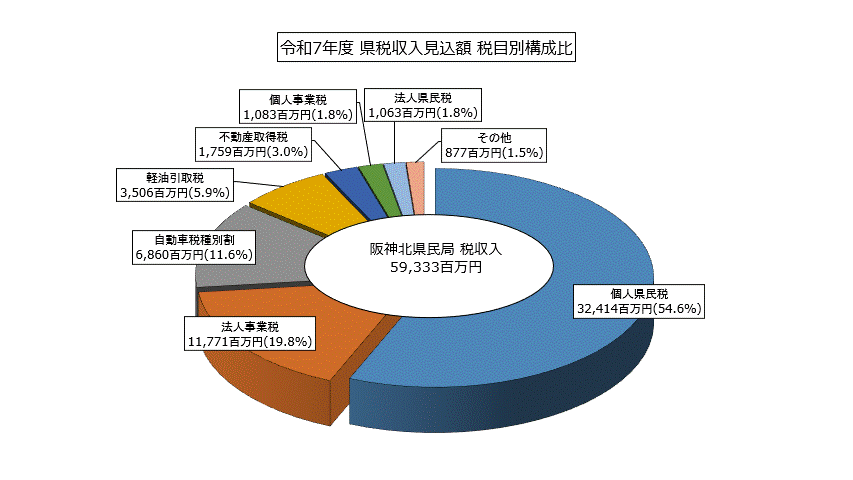 主な税目として、個人県民税が324億14百万円(構成比54.6%)、法人事業税が117億71百万円(構成比19.8%)、自動車税種別割が68億60百万円(構成比11.6%)であり、個人県民税の構成比が54.6%と県全体の同構成比28.3%に比較して高いことが当管内の特色です。