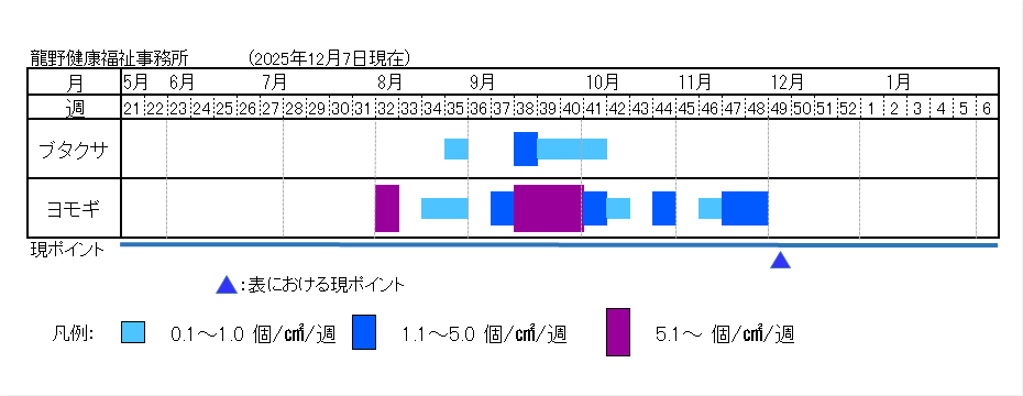 キク科ブタクサ属の花粉は洲本で、ヨモギ属は豊岡、洲本、健科研(加古川)で飛散が確認されています。