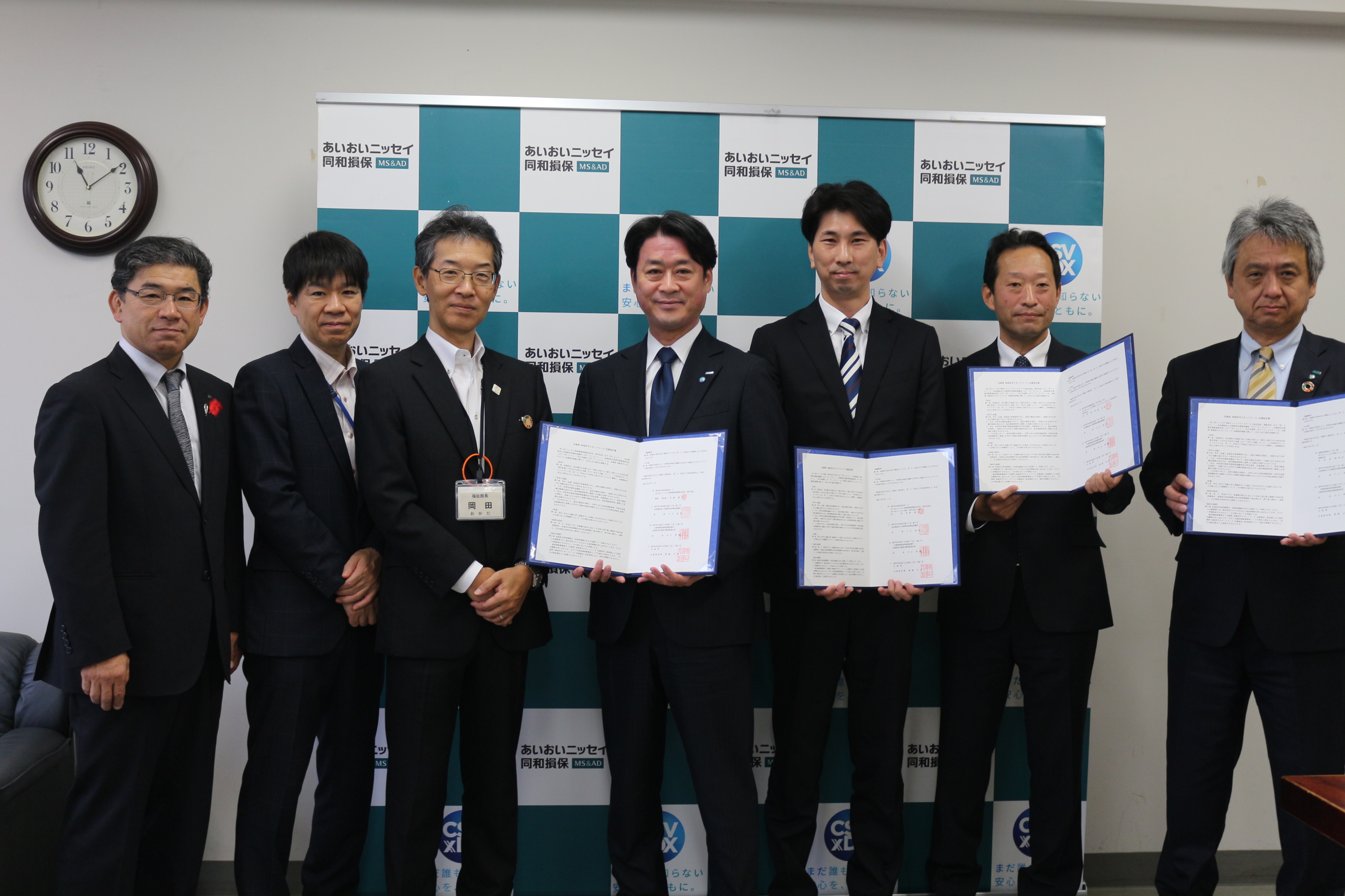 (写真:協定締結式に出席いただいた事業者の代表者4名、福祉部長(左から3番目)、地域福祉課長(左から2番目)および兵庫県社会福祉協議会事務局長(左))