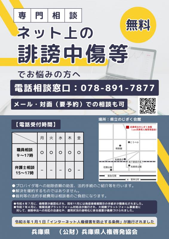 兵庫県では、(公財)兵庫県人権啓発協会に委託して、インターネット上の誹謗中傷や差別等に関する弁護士と専門職員(サポートチーム)による解決に向けた相談窓口を開設しています。