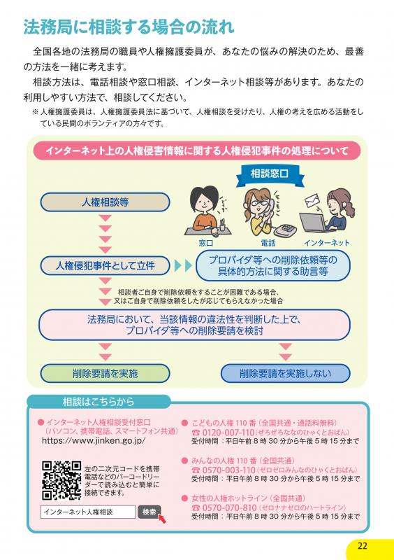 法務局では、まず、プロバイダへの発信者情報の開示請求や人権侵害情報の削除依頼の方法について助言を行うなど、被害者自らが被害を回復・予防を図るための手助けをします。
