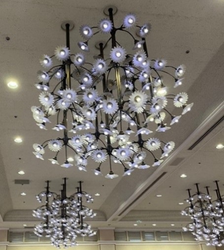 シャンデリアは県花“のじぎく”の花となっており、1基のシャンデリアに144個の花の電灯があり、全部で10基、合計1,440個の花の電灯があります。