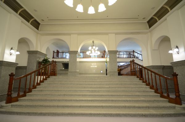 瓦造3階建、ロの字型平面を持つ建築には、大小15室の部屋を備えています。階段の手すりや腰壁の羽目板などの造作から家具調度品、照明器具、カーテン、金具ひとつに至るまですべてルネサンス調で仕上げられています。