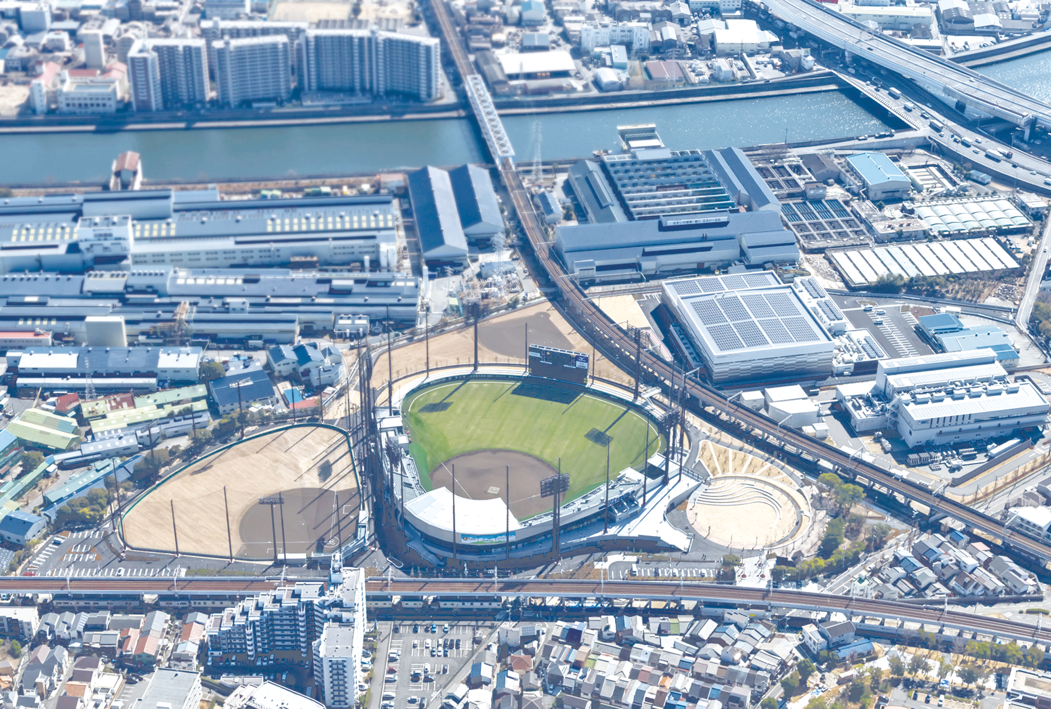 「ゼロカーボンシティ」を目指す尼崎市のシンボル施設として3月1日にオープンした「ゼロカーボンベースボールパーク」には、阪神タイガースの二軍が使用するメインスタジアムを中心に、市民球場や多目的広場などがそろっています。太陽光発電や蓄電池で電力の一部を賄うほか、スタジアムの屋根に降った雨水や、井水をグラウンドの散水やトイレの洗浄に利用するなど、環境に配慮したさまざまな設備を備えています。(尼崎市産業政策課)