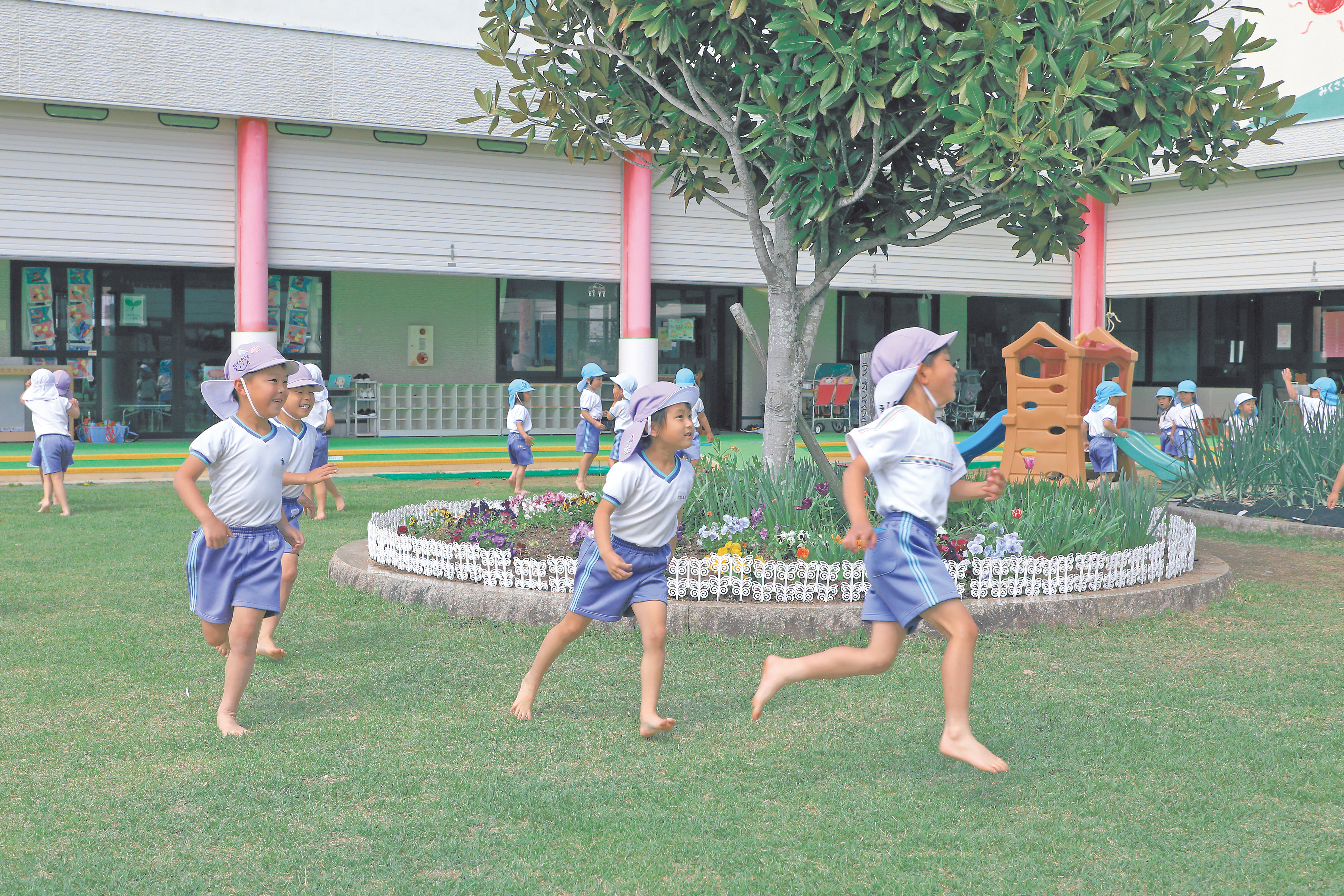 芝生の上で自由に遊ぶ子どもたち。夏の暑さ対策にも効果があるそうです。