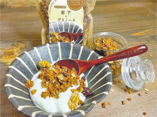 スーパーフードの菊芋を乾燥させてグラノーラに。神戸市須磨区の障害福祉サービス事業所「パイオニア」など5つの事業所が栽培から加工まで行っています。「プレーン」1袋(80g)730円、「オリジナル甘味」1袋(100g)760円。インターネットでも販売しています。
