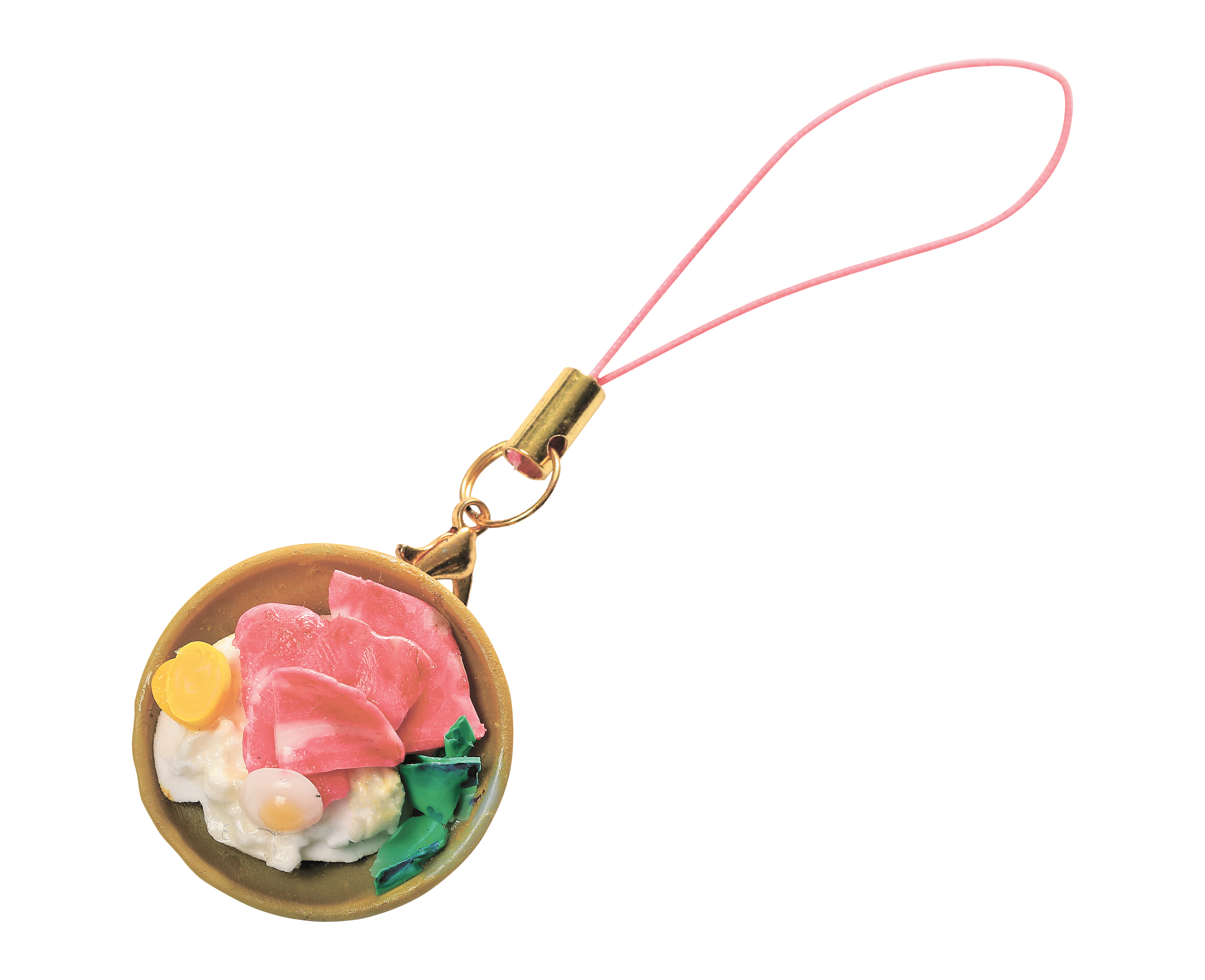 丼のミニチュアは3種類。ストラップとピンバッジの2タイプあります。)