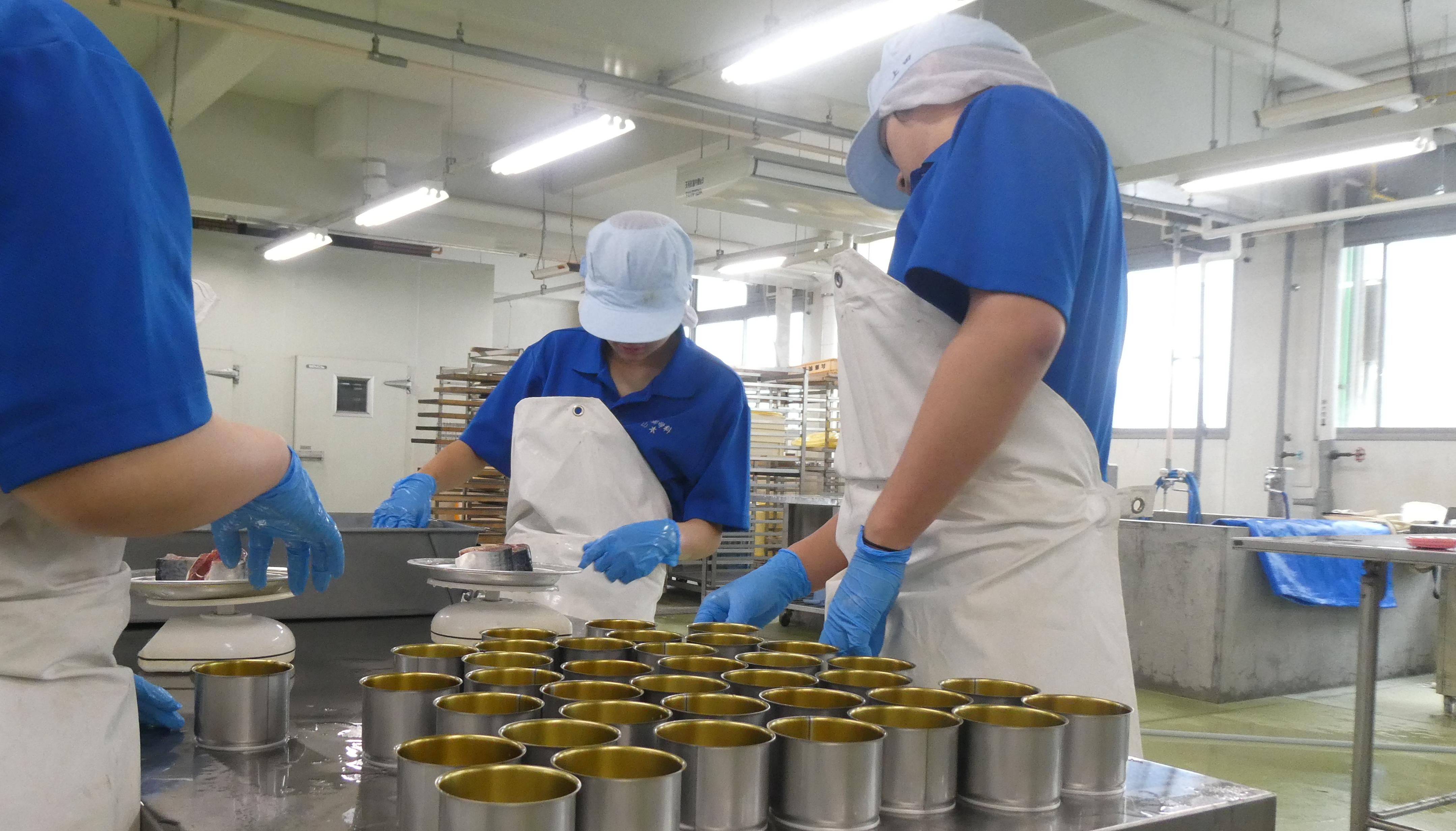 - 2年生、3年生で行う水産加工実習では、地元や近海で水揚げされたサバやイワシを使って缶詰や干物の製造に取り組みます。獲れ過ぎて余ってしまった魚や、市場の需要が低く、売れない魚などの活用にも力を注いでいます。