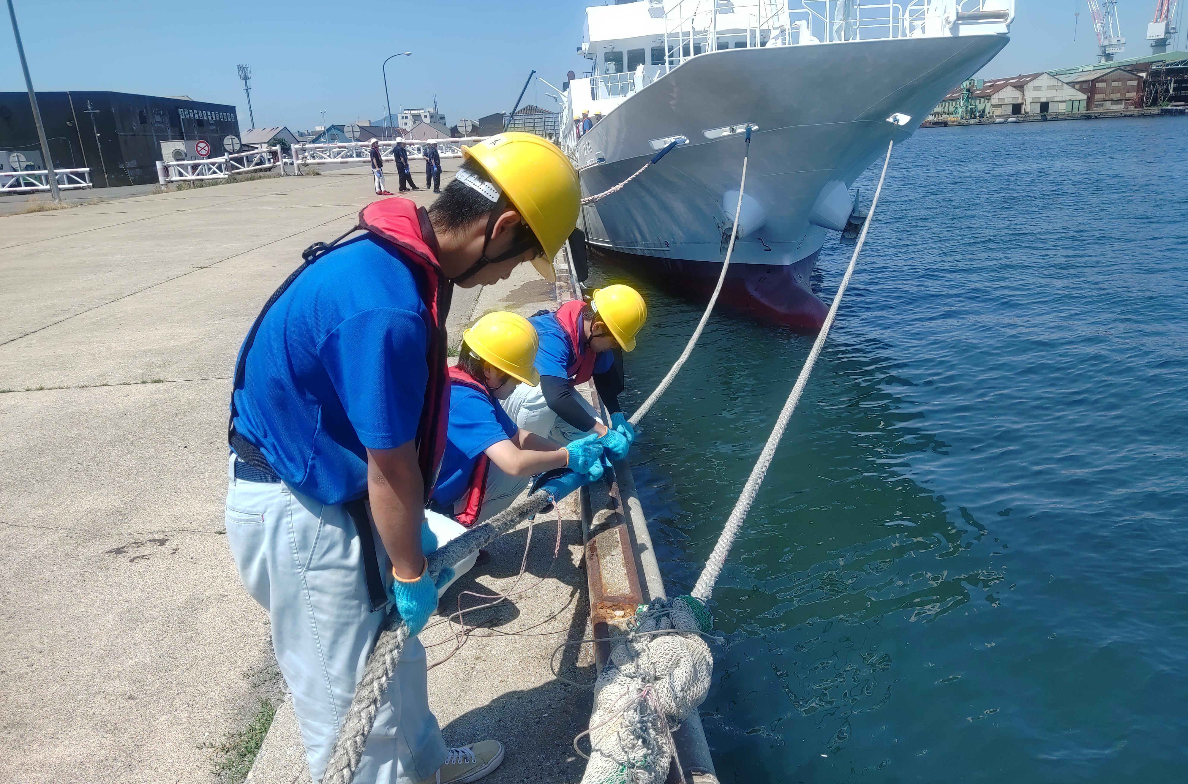 - 2年生の10月と3年生の6月に行われる漁業航海実習では、大型実習船「但州丸」に乗り、約40日間、日本近海を航行します。また、操船、甲板作業、漁業の3グループに分かれ、それぞれの実技作業を習得します。