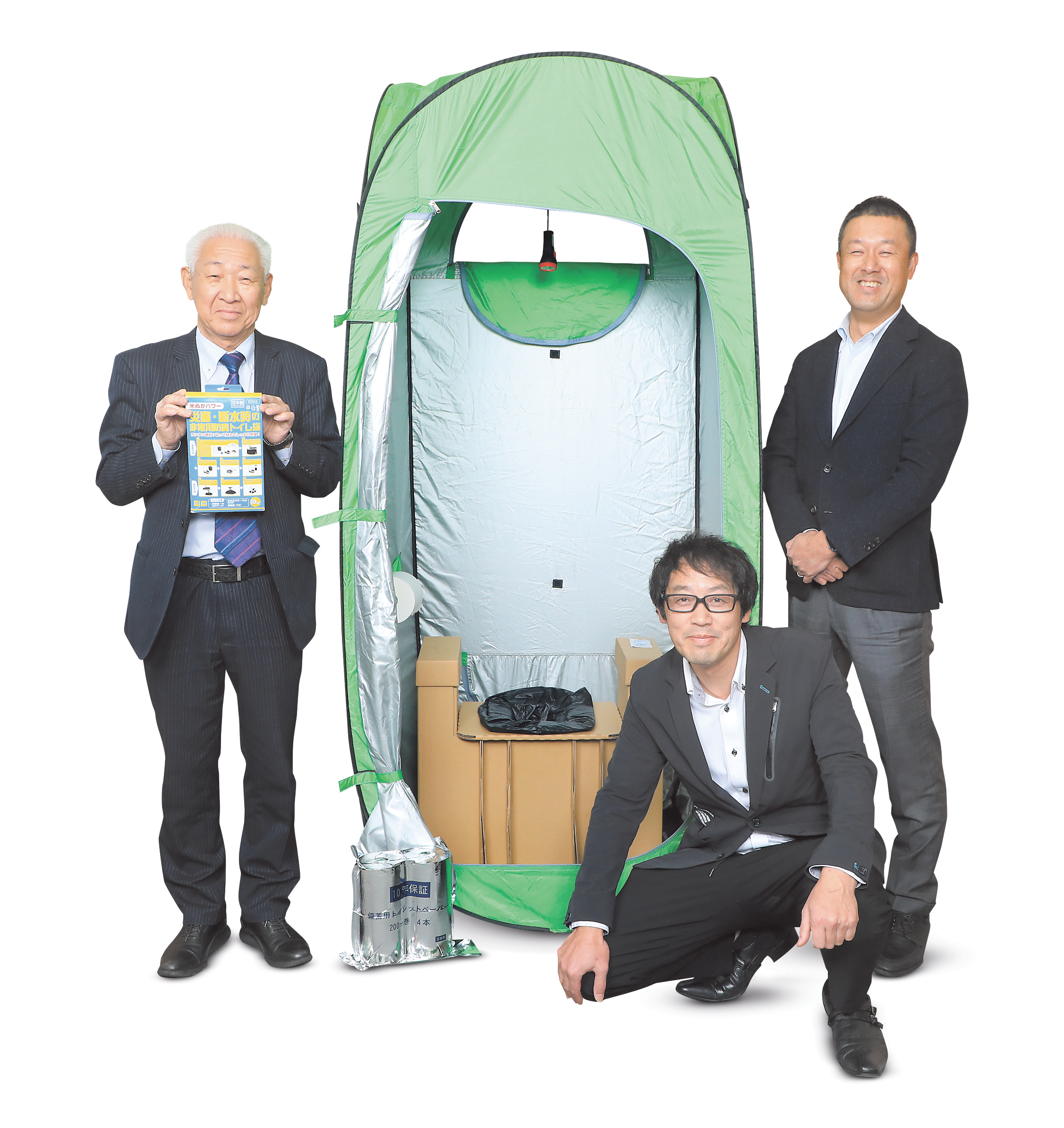 豊岡市で作業着販売業を営んでおり、防災関連用品も扱っています。2024(令和6)年の能登半島地震の時は避難所のトイレ不足が課題となったことから、新商品として備蓄できるトイレを開発することに。取引先である市内の段ボールメーカー、(株)豊岡紙器の組み立て式トイレに、同じく市内のポリ袋メーカー、丸真化学工業(株)の防臭袋を合わせ、目隠し用のテントも加えました。座面の高さは洋式トイレとほぼ同じ約40cmで、耐荷重200kgと強度も万全。高齢者が利用しやすいよう便座の両側に手すりをつけました。トイレの行き控えによるストレスや病気を防ぐためにも、自治体や自治会、企業に備蓄トイレの重要性、簡易性をアピールしていきたいと思います。(作業服のコバックス代表 永澤賢作さん)