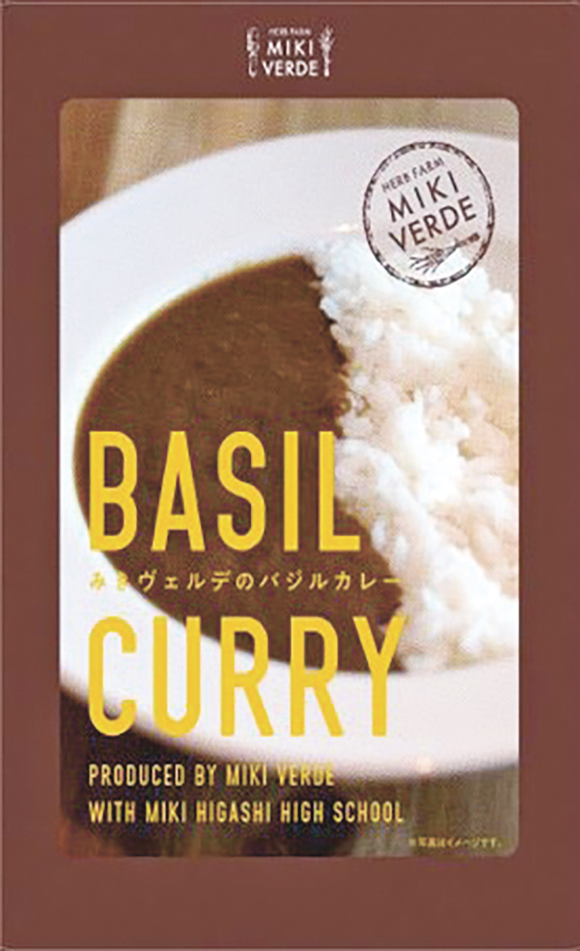 県立三木東高校の「アントレプレナー(起業)」の授業から誕生したレトルトカレー。生徒とボランティアが無農薬で育てたバジルをふんだんに使っています。
