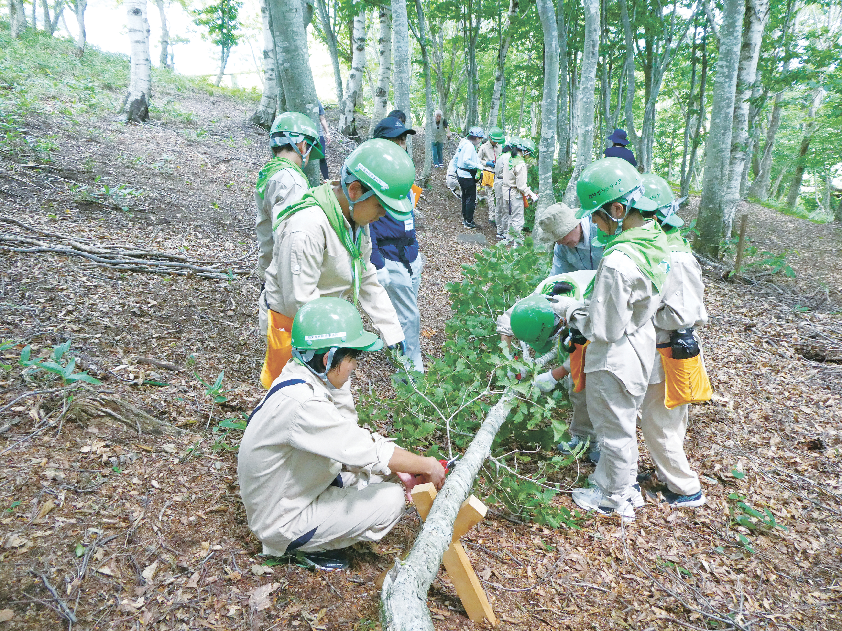 緑の少年団は、森や緑を守り育てることを目的とした、子どもたちが主体の団体です。活動は大きく分けると、森の機能や保全について学ぶ学習活動、植樹や樹木の手入れを行う奉仕活動、ハイキングやキャンプなどを楽しむレクリエーション活動の3つ。2025(令和7)年10月現在、県内で120団、7,567人の団員が、自然の中で学び、遊びながら森と豊かな心を育んでいます。緑を守る一員になりませんか。(県治山課)