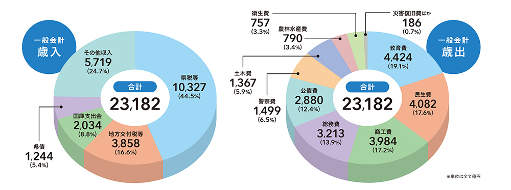 | 歳入 | 【県税等】県民税や事業税など、県に納められる税金 【地方交付税】地方公共団体が一定の行政サービスを提供できるよう、一定の合理的な基準によって国が再配分するお金 【国庫支出金】特定の事業の財源として国が交付するお金 【県債】道路整備等の資金調達で、国や銀行などから長期間借り入れるお金 【その他収入】県税の延滞金や預金利子、県からの貸付金の元利償還金など |