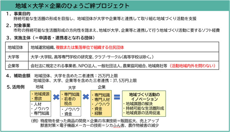 持続可能な生活圏の形成を目指し、地域の活動団体が大学と企業等と連携して取り組む地域づくり活動に要する経費の一部を助成します。