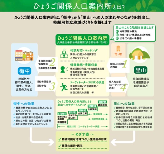 兵庫県では、多自然地域における活動の担い手として期待される「関係人口」を創出するため、「ひょうご関係人口案内所」を設置し、多自然地域からの相談に応じ、地域外への情報発信と地域活動への参加者受入のコーディネートを行っています。