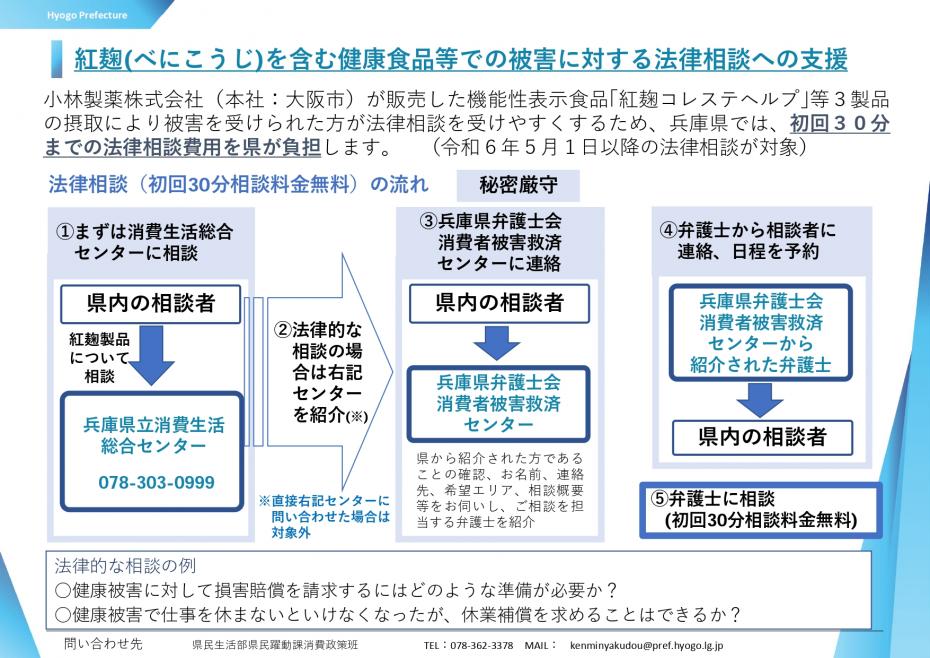 摂取により被害を受けられた方からの法律的な相談に対応するため、初回30分までの法律相談費用を兵庫県が負担します。
