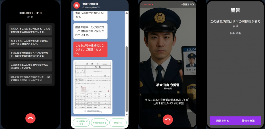 「スマートフォン向け詐欺検知システム」でどのようなことを体験できるかについて、株式会社ToINexus(外部サイトへリンク)のページからご確認ください。
