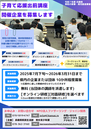 子育てをしやすい社会づくりに向けた環境を整備するため、男性が家事・育児に参画することへの理解と意識を醸成することを目的としたセミナーの開催を希望する施設・団体へ県から講師を無料で派遣しますので、ぜひお申し込みください。