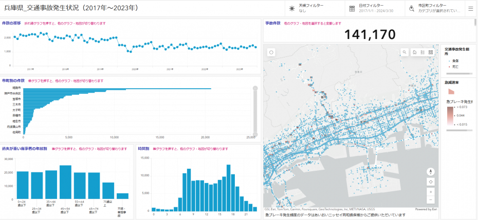 県内の交通事故発生数は減少傾向にあるものの、依然として尊い命が失われる事故が発生しています。兵庫県では、交通事故ゼロを目指し、安全で快適な交通社会を実現するため、交通安全意識啓発の一環として、兵庫県警察本部による「交通事故発生状況」のデータを分かりやすく表示する「交通事故発生状況ダッシュボード」を公開してきました。