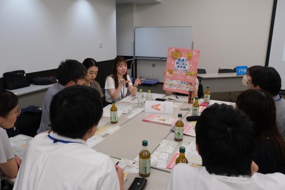 A/B班のテーマは「おいしい朝ごはん食べよう」。県の健康増進課の栄養士や流通戦略課の地産地消担当とともに議論を展開。「モーニングのおすすめ情報って意外と少ないからそういうものを発信するのはどうか」「県産食材で朝ごはんに合うものをもっとアピールするべき」という意見や、「単身か家族かによって全然違うからまずはターゲットを考えるべきでは」という意見も。