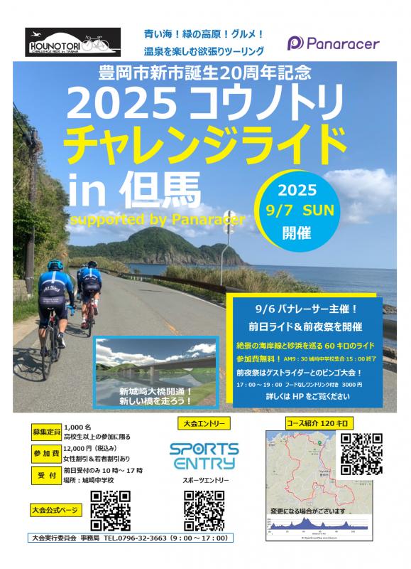 城崎温泉をスタート&ゴールに、今年完成した城崎大橋を通り、高原あり海あり城下町ありの多様な風景を楽しむことができるイベントです。ゴール後は、参加賞の1つである外湯券で温泉施設を利用できます。